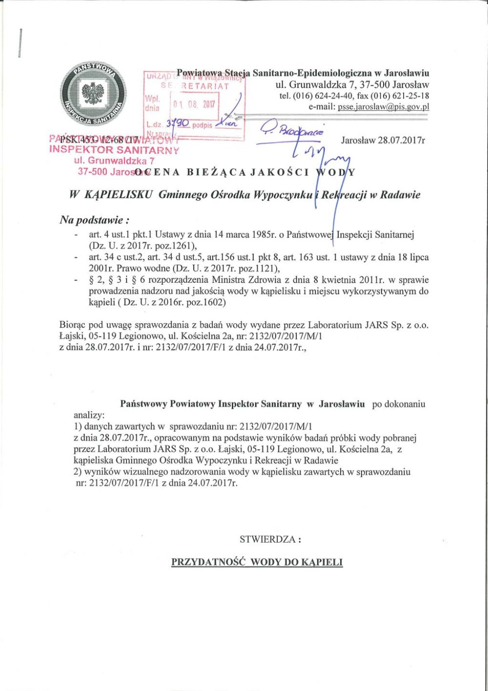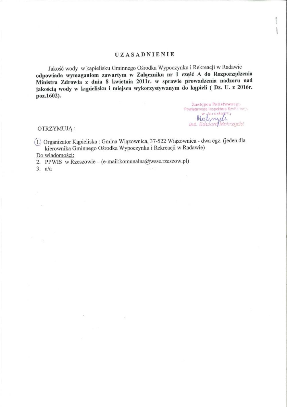 Ocena bieżąca jakości wody w kąpielisku Gminnego Ośrodka Wypoczynku i Rekreacji w Radawie